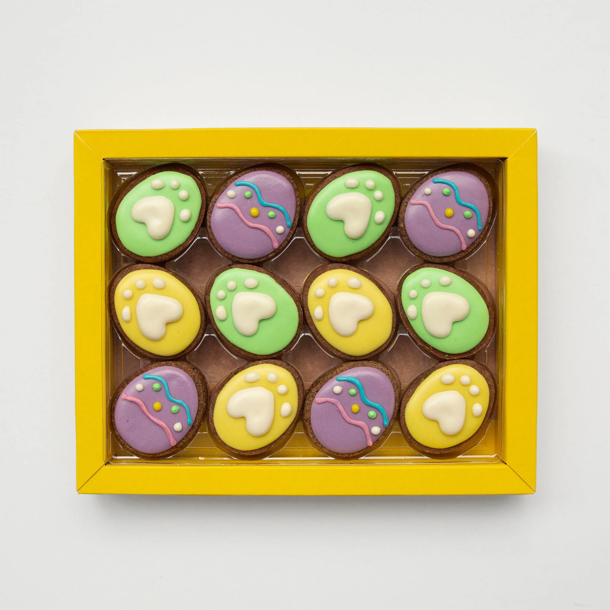 Each box includes 12 homemade dog biscuits in shape of eggs which are beautifully decorated with dog friendly icing with colours derived from fruits and vegetables. Delicious and nutritious!