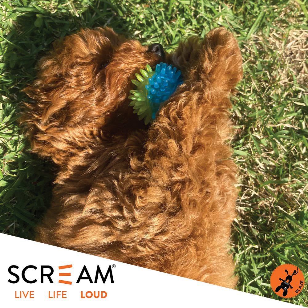 Blaze likes a multipurpose dog toy, which is why he loves the Scream Galaxy Ball! Made of TPR rubber, this ball has a high bounce. It's rounded spikes are designed to keep your dog entertained while gently massaging their gums. Has a squeaker for added Scream fun! This ball also floats - making it perfect for the beach, the park, the backyard, plus anywhere that you enjoy spending time with your dog. The Scream Galaxy Ball is perfect for chase and fetch, meaning more Scream fun for you and your dog to enjoy and Live Life LOUD, just as Blaze does!
